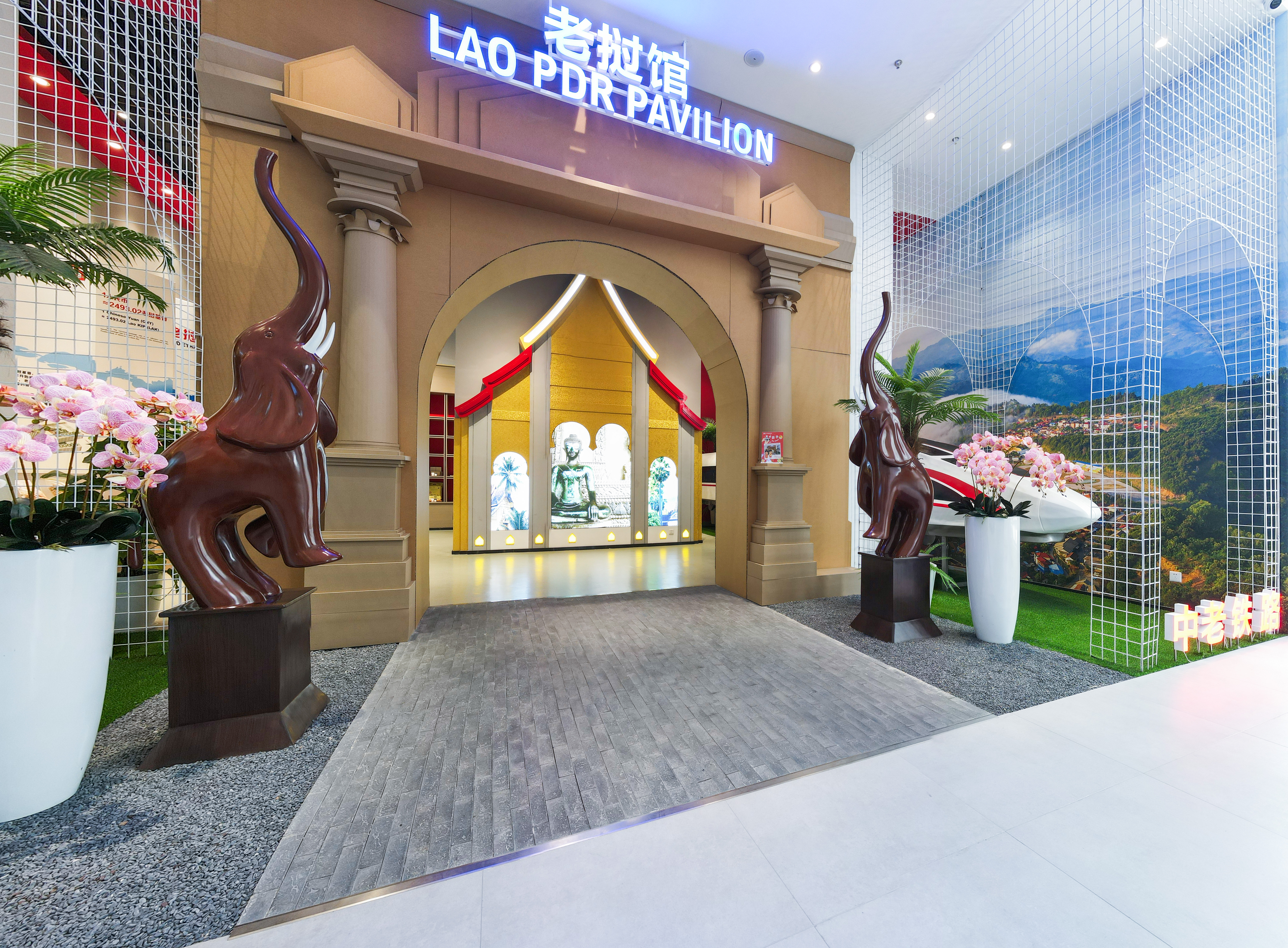 來到老撾館,考察團(tuán)立即被醒目的、象征中老友誼的“中老鐵路”所吸引。入口處兩尊工藝精湛、栩栩如生的大象木雕,以及仿照老撾凱旋門廣場(chǎng)精心設(shè)計(jì)的門頭造型,都令考察團(tuán)成員仿佛置身老撾。當(dāng)?shù)弥蠐氲钠【啤⒉枞~等特色商品通過匯聚中心線上線下平臺(tái)受到了越來越多的消費(fèi)者青睞時(shí),希帕占·南塔馮薩副主席深表感謝,也非常感動(dòng)在中國還有如此創(chuàng)意且專為老撾商家進(jìn)行商品展銷的展館,為老撾商家創(chuàng)造了無限商機(jī),讓更多的人通過匯聚中心知道老撾、了解老撾進(jìn)而走進(jìn)老撾,也成為促進(jìn)中老雙邊經(jīng)貿(mào)往來的重要窗口!
